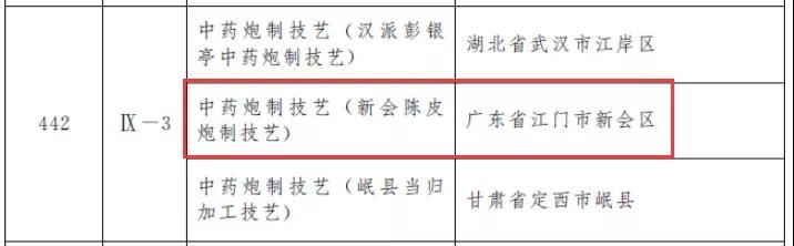 2020年12月21日,文化和旅游部将第五批国家级非物质文化遗产代表性项目推荐项目名单向社会公示,推荐项目337项,其中,新会陈皮炮制技艺入选传统医药(中药炮制技艺)国家级非物质文化遗产代表性项目名录。