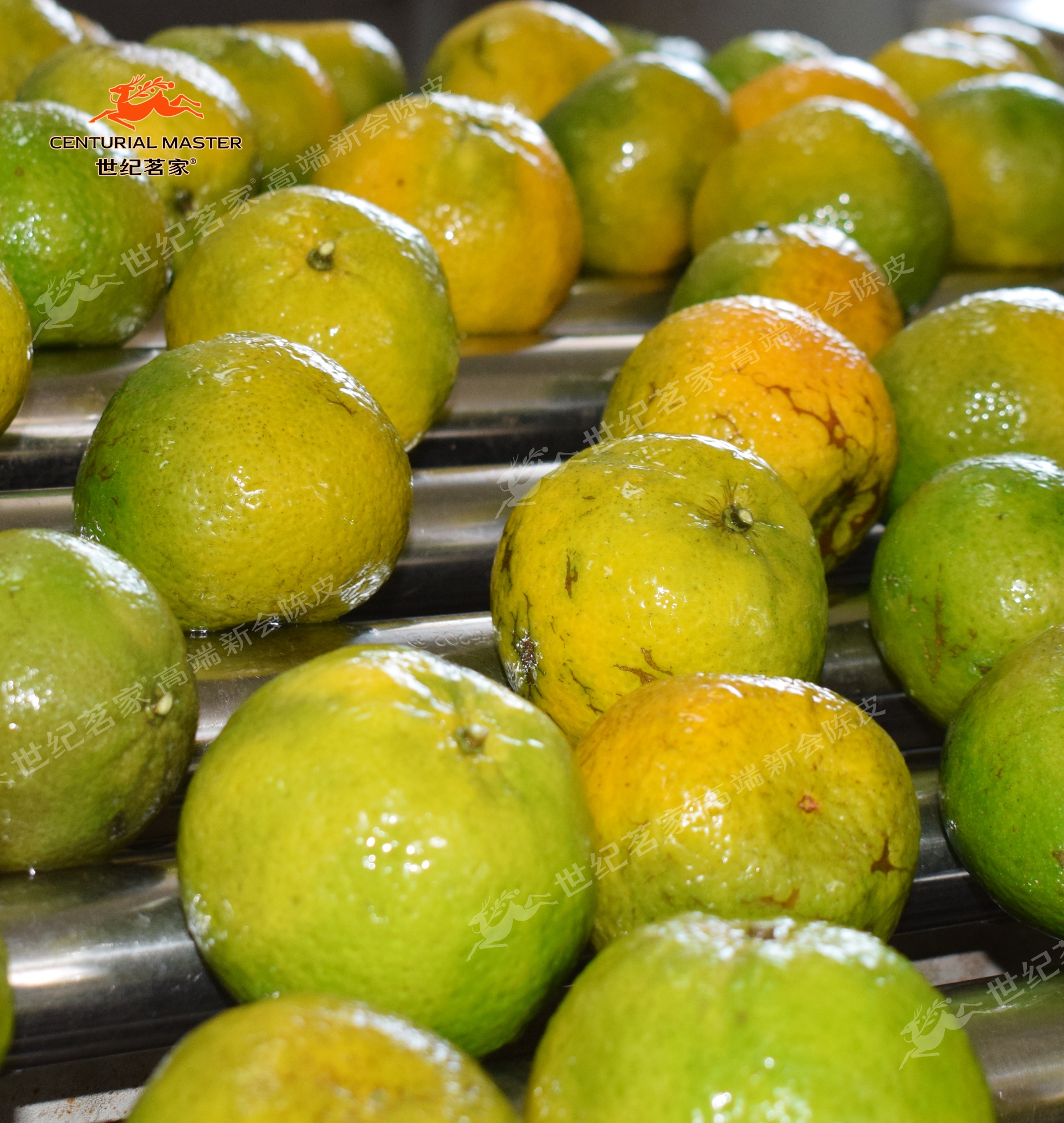柑果采摘全程不沾地,1小时内运回工厂,3小时内进入生产流程,鲜度有保证;活水浸泡、滚动刷洗、臭氧降解、