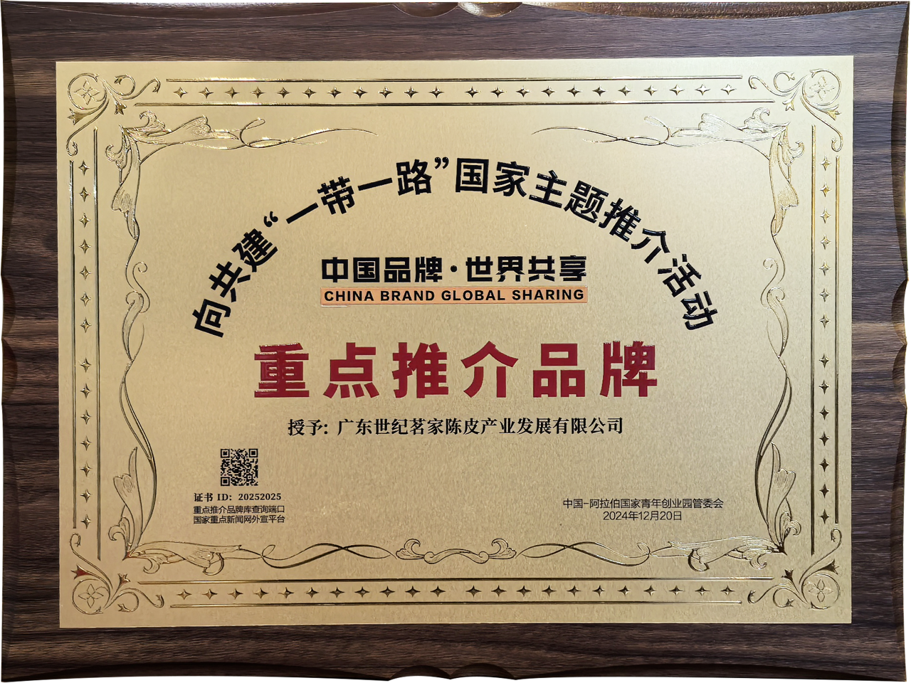 1月5日,世纪茗家应邀参加“2025中国品牌出海全球发布会”,在向共建“一带一路”国家主题推介活动中获得“中国品牌·世界共享”重点推介品牌荣誉称号。作为唯一陈皮品牌,很荣幸向“一带一路”国家分享新会陈皮,让新会陈皮走出国门,走向全球!
